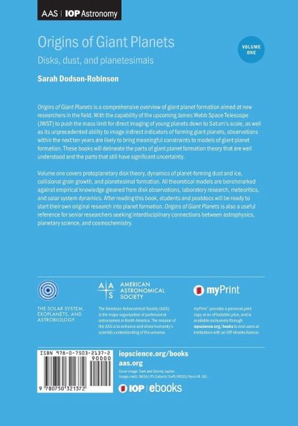 Origins of Giant Planets is a comprehensive overview of giant planet formation aimed at new researchers in the field. Volume one covers protoplanetary disk theory, dynamics of planet-forming dust and ice, collisional grain growth, and planetesimal formation. The book is a valuable reference for astronomers and planetary scientists who study giant planets, and for graduate students studying exoplanets or planetary science.