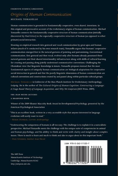 Human communication is grounded in fundamentally cooperative, even shared, intentions. In this original and provocative account of the evolutionary origins of human communication, Michael Tomasello connects the fundamentally cooperative structure of human communication (initially discovered by Paul Grice) to the especially cooperative structure of human (as opposed to other primate) social interaction. Tomasello argues that human cooperative communication rests on a psychological infrastructure of shared intentionality (joint attention, common ground), evolved originally for collaboration and culture more generally. The basic motives of the infrastructure are helping and sharing: humans communicate to request help, inform others of things helpfully, and share attitudes as a way of bonding within the cultural group. These cooperative motives each created different functional pressures for conventionalizing grammatical constructions. Requesting help in the immediate you-and-me and here-and-now, for example, required very little grammar, but informing and sharing required increasingly complex grammatical devices. Drawing on empirical research into gestural and vocal communication by great apes and human infants (much of it conducted by his own research team), Tomasello argues further that humans' cooperative communication emerged first in the natural gestures of pointing and pantomiming. Conventional communication, first gestural and then vocal, evolved only after humans already possessed these natural gestures and their shared intentionality infrastructure along with skills of cultural learning for creating and passing along jointly understood communicative conventions. Challenging the Chomskian view that linguistic knowledge is innate, Tomasello proposes instead that the most fundamental aspects of uniquely human communication are biological adaptations for cooperative social interaction in general and that the purely linguistic dimensions of human communication are cultural conventions and constructions created by and passed along within particular cultural groups.