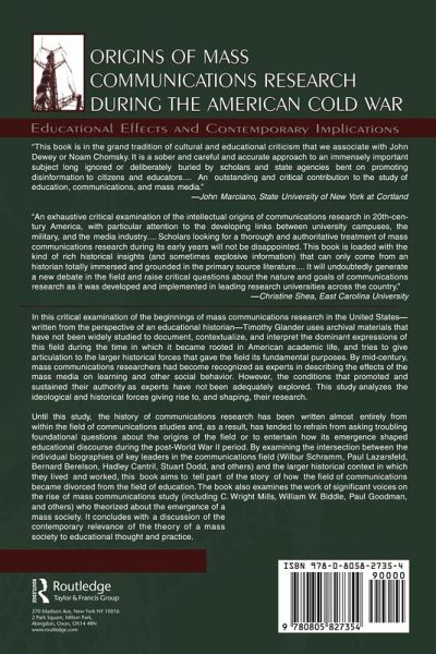 In this critical examination of the beginnings of mass communications research in the United States, written from the perspective of an educational historian, Timothy Glander uses archival materials that have not been widely studied to document, contextualize, and interpret the dominant expressions of this field during the time in which it became rooted in American academic life, and tries to give articulation to the larger historical forces that gave the field its fundamental purposes. By mid-century, mass communications researchers had become recognized as experts in describing the effects of the mass media on learning and other social behavior. However, the conditions that promoted and sustained their authority as experts have not been adequately explored. This study analyzes the ideological and historical forces giving rise to, and shaping, their research.