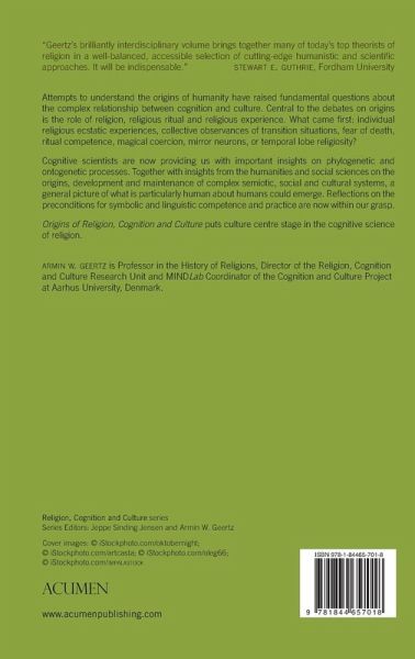 Attempts to understand the origins of humanity have raised fundamental questions about the complex relationship between cognition and culture. Central to the debates on origins is the role of religion, religious ritual and religious experience. What came first: individual religious (ecstatic) experiences, collective observances of transition situations, fear of death, ritual competence, magical coercion; mirror neurons or temporal lobe religiosity? Cognitive scientists are now providing us with important insights on phylogenetic and ontogenetic processes. Together with insights from the humanities and social sciences on the origins, development and maintenance of complex semiotic, social and cultural systems, a general picture of what is particularly human about humans could emerge. Reflections on the preconditions for symbolic and linguistic competence and practice are now within our grasp. Origins of Religion, Cognition and Culture puts culture centre stage in the cognitive science of religion.