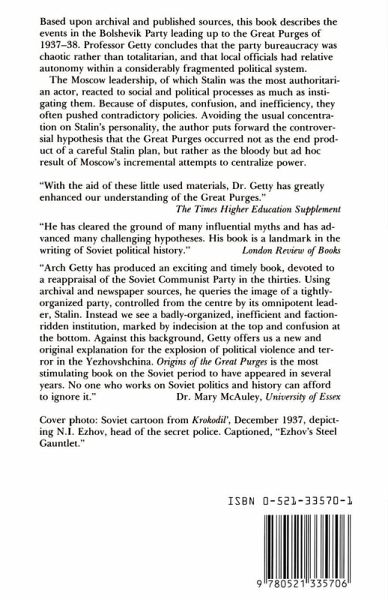 Based upon archival and published sources, this book describes the events in the Bolshevik Party leading up to the Great Purges of 1937-38. Professor Getty concludes that the party bureaucracy was chaotic rather than totalitarian, and that local officials had relative autonomy within a considerably fragmented political system. The Moscow leadership, of which Stalin was the most authoritarian actor, reacted to social and political processes as much as instigating them. Because of disputes, confusion, and inefficiency, they often pushed contradictory policies. Avoiding the usual concentration on Stalin's personality, the author puts forward the controversial hypothesis that the Great Purges occurred not as the end product of a careful Stalin plan, but rather as the bloody but ad hoc result of Moscow's incremental attempts to centralize power.