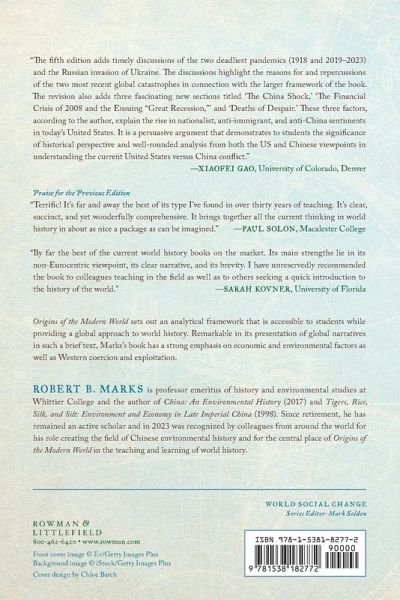 Origins of the Modern World sets out an analytical framework that is accessible to students while providing a global approach to world history. Remarkable in its presentation of global narratives in such a brief text. Marks's book has a strong emphasis on economic and environmental factors as well as Western coercion and exploitation.