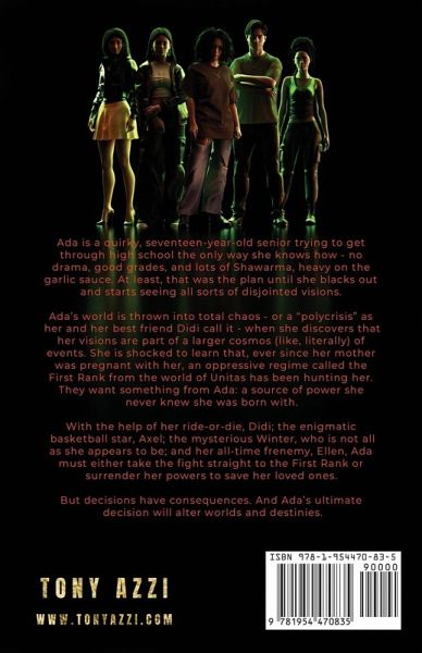 Ada is a quirky, seventeen-year-old senior trying to get through high school the only way she knows how - no drama, good grades, and lots of Shawarma, heavy on the garlic sauce. At least, that was the plan until she blacks out and starts seeing all sorts of disjointed visions. Ada's world is thrown into total chaos - or a "polycrisis" as her and her best friend Didi call it - when she discovers that her visions are part of a larger cosmos (like, literally) of events. She is shocked to learn that, ever since her mother was pregnant with her, an oppressive regime called the First Rank from the world of Unitas has been hunting her. They want something from Ada: a source of power she never knew she was born with. With the help of her ride-or-die, Didi; the enigmatic basketball star, Axel; the mysterious Winter, who is not all as she appears to be; and her all-time frenemy, Ellen, Ada must either take the fight straight to the First Rank or surrender her powers to save her loved ones. But decisions have consequences. And Ada's ultimate decision will alter worlds and destinies.