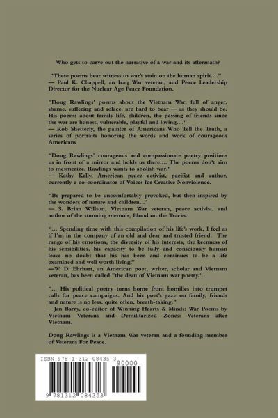 "Doug Rawlings' poems about the Vietnam War, full of anger, shame, suffering and solace, are hard to bear--as they should be. His poems about family life, children, the passing of friends since the war are honest, vulnerable, playful and loving. Together they allow him, and us, full humanity, an expansion of humanity that is particularly poignant in light of its denial to those on both sides who did not survive the war." - Rob Shetterly "I have met Doug Rawlings only once, and then only in passing at a Veterans for Peace convention in his home state of Maine in 2010, but I have been reading his poetry for nearly 40 years. Spending time with this compilation of his life's work, I feel as if I'm in the company of an old and dear and trusted friend. The range of his emotions, the diversity of his interests, the keenness of his sensibilities, his capacity to be fully and consciously human leave no doubt that his has been and continues to be a life examined and well worth living." - W. D. Ehrhart