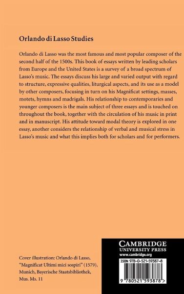 Orlando di Lasso was probably the most famous and most popular composer of the second half of the 1500s. This book of essays written by leading scholars from Europe and the United States is a survey of a broad spectrum of Lasso's music. The essays discuss his large and varied output with regard to structure, expressive qualities, liturgical aspects and its use as a model by other composers, focusing in turn on his Magnificat settings, masses, motets, hymns and madrigals. His relationship to contemporaries and younger composers is the main subject of three essays and is touched on throughout the book, together with the circulation of his music in print and in manuscript. His attitude toward modal theory is explored in one essay, and another considers the relationship of verbal and musical stress in Lasso's music and what this implies both for scholars and for performers.