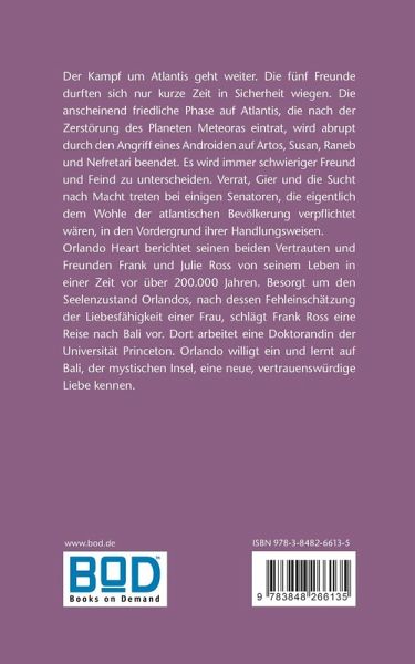 Der Kampf um Atlantis geht weiter. Die fünf Freunde durften sich nur kurze Zeit in Sicherheit wiegen. Die anscheinend friedliche Phase auf Atlantis, die nach der Zerstörung des Planeten Meteoras eintrat, wird abrupt durch den Angriff eines Androiden auf Artos, Susan, Raneb und Nefretari beendet. Es wird immer schwieriger Freund und Feind zu unterscheiden. Verrat, Gier und die Sucht nach Macht treten bei einigen Senatoren, die eigentlich dem Wohle der atlantischen Bevölkerung verpflichtet wären, in den Vordergrund ihrer Handlungsweisen.Orlando Heart berichtet seinen beiden Vertrauten und Freunden Frank und Julie Ross von seinem Leben in einer Zeit vor über 200.000 Jahren. Besorgt um den Seelenzustand Orlandos, nach dessen Fehleinschätzung der Liebesfähigkeit einer Frau, schlägt Frank Ross eine Reise nach Bali vor. Dort arbeitet eine Doktorandin der Universität Princeton. Orlando willigt ein und lernt auf Bali, der mystischen Insel, eine neue, vertrauenswürdige Liebe kennen.