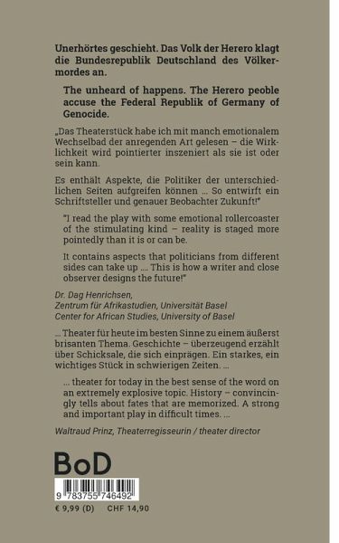 "Das Theaterstück habe ich mit manch emotionalem Wechselbad der anregenden Art gelesen - die Wirklichkeit wird pointierter inszeniert als sie ist oder sein kann.Es enthält Aspekte, die Politiker der unterschiedlichen Seiten aufgreifen können.... So entwirft ein Schriftsteller und genauer Beobachter Zukunft!"Dr. Dag Henrichsen, Zentrum für Afrikastudien, Universität Basel ... Theater für heute im besten Sinne zu einem äußerst brisanten Thema. Geschichte - überzeugend erzählt über Schicksale, die sich einprägen. Ein starkes, ein wichtiges Stück in schwierigen Zeiten. ... Waltraud Prinz, Theaterregisseurin"I read the play with some emotional rollercoaster of the stimulating kind - reality is staged more pointedly than it is or can be.It contains aspects that politicians from different sides can take up.... This is how a writer and close observer designs the future!"Dr. Dag Henrichsen, Center for African Studies, University of Basel ... theater for today in the best sense of the word on an extremely explosive topic. History - convincingly tells about fates that are memorized. A strong and important play in difficult times. ...Waltraud Prinz, theater director
