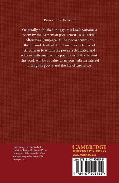 Originally published in 1937, this book contains a poem by the Armenian poet Ernest Haik Riddall Altounyan (1889-1962). The poem centres on the life and death of T. E. Lawrence, a friend of Altounyan to whom the poem is dedicated and whose death inspired the poet to write this lament. This book will be of value to anyone with an interest in English poetry and the life of Lawrence.