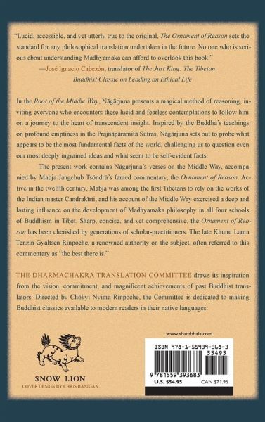 In the Root of the Middle Way, Nagarjuna presents a magical method of reasoning, inviting everyone who encounters these lucid and fearless contemplations to follow him on a journey to the heart of transcendent insight. Inspired by the Buddha's teachings on profound emptiness in the Prajnaparamita Sutras, Nagarjuna sets out to probe what appears to be the most fundamental facts of the world, challenging us to question even our most deeply ingrained ideas and what seem to be self-evident facts. In a series of unassuming and penetrating investigations, he asks basic questions such as: "What does it mean for something to occur? What is meant by 'going' or by 'coming'? Does the eye see? Does fire burn fuel? What is an example of being right? What does it mean to be wrong? Nagarjuna extends an invitation to open-minded and unprejudiced inquiry, and from his reader he asks for nothing more and nothing less than sincere and honest answers. Yet where are our answers? Once we begin to follow Nagarjuna's clear and direct steps, the gateway to the inconceivable emerges-perhaps unexpectedly. The present work contains Nagarjuna's verses on the Middle Way accompanied by Mabja Jangchub Tsöndrü's famed commentary, the Ornament of Reason. Active in the twelfth century, Mabja was among the first Tibetans to rely on the works of the Indian master Candrakirti, and his account of the Middle Way exercised a deep and lasting influence on the development of Madhyamaka philosophy in all four schools of Buddhism in Tibet. Sharp, concise, and yet comprehensive, the Ornament of Reason has been cherished by generations of scholar-practitioners. The late Khunu Lama Tenzin Gyaltsen Rinpoche, a renowned authority on the subject, often referred to this commentary as "the best there is." A visual outline of the commentary has been added that clearly shows the structure of each chapter and makes the arguments easier to follow.