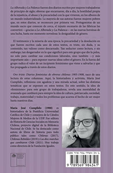 La Alborada y La Palanca fueron dos diarios escritos por mujeres trabajadoras de principio de siglo; obreras que encarnaron, día a día, la hostilidad propia de la injusticia, el abuso y la precariedad con la que vivieron, en los albores de un mundo industrializado. La mayoría de sus autoras fueron mujeres pobres que, en estos diarios, se reconocen por primera vez. Protagonistas de un mundo sucio que conocen de cerca, el injusto escenario de las fábricas las convertirá -gracias a La Alborada y La Palanca- en las nuevas heroínas de una lucha, hasta ese momento novedosa: la desigualdad de género. El testimonio y la miseria de una época; la precariedad y la desolación en que fueron escritos cada uno de estos textos, es triste, sin duda, y su contenido, tan valioso como descarnado. Tan seductor como lectura, y sin embargo, tan desgarrador en lo que signi có para este grupo que dio la pelea, no solo para cambiar sus condiciones laborales, sino también -y más importante aún- para exponer nuevas ideas sobre el género. En la fuerza del grupo radica el valor de un incipiente feminismo que viene a salvarlas y que fue propagado a través de estos diarios. Oro triste: Diarios feministas de obreras chilenas 1905-1908, nace de una lectura de estas columnas. Aquí, la historiadora y activista, María José Cumplido, re exiona con agudeza y una mirada actual, sobre las distintas temáticas que se exponen en estos textos. En este sentido, la idea de feminismo para este grupo de trabajadoras, revela una mentalidad de avanzada que cambiará para siempre la idea de cultura, patriarcado, sociedad, trabajo, maternidad y todos los problemas que acarrea el hecho de ser mujer hasta nuestros días.