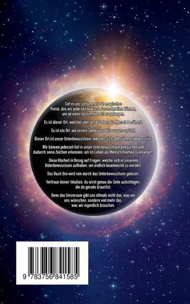 Tief in uns schlummert ein magisches Portal, das wir jederzeit bewusst durchschreiten können, um an einen bestimmten Ort zu gelangen.Es ist dieser Ort, welcher über unser Leben als Mensch bestimmt.Es ist ein Ort, wo unsere Seele ganz leise zu uns spricht.Dieser Ort ist unser Unterbewusstsein, welches sich selbst immer bewusst ist.Wir können jederzeit tief in unser Unterbewusstsein eintauchen und dadurch seine Zeichen erkennen, um im Leben als Mensch Klarheit zu erlangen.Diese Klarheit in Bezug auf Fragen, welche sich in unserem Unterbewusstsein aufhalten, um endlich beantwortet zu werden.Das Buch Oro wird rein durch das Unterbewusstsein gelesen.Vertraue deiner Intuition, du wirst genau die Seite aufschlagen, die du gerade brauchst.Denn das Universum gibt uns oftmals nicht das, was wir uns wünschen, sondern viel mehr das, was wir eigentlich brauchen.