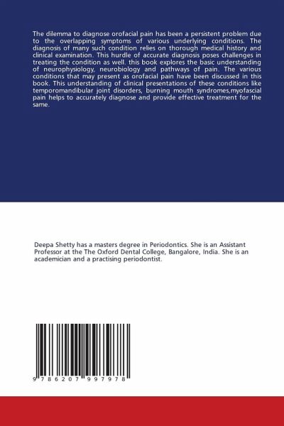The dilemma to diagnose orofacial pain has been a persistent problem due to the overlapping symptoms of various underlying conditions. The diagnosis of many such condition relies on thorough medical history and clinical examination. This hurdle of accurate diagnosis poses challenges in treating the condition as well. this book explores the basic understanding of neurophysiology, neurobiology and pathways of pain. The various conditions that may present as orofacial pain have been discussed in this book. This understanding of clinical presentations of these conditions like temporomandibular joint disorders, burning mouth syndromes,myofascial pain helps to accurately diagnose and provide effective treatment for the same.