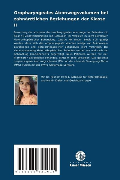Bewertung des Volumens der oropharyngealen Atemwege bei Patienten mit Klasse-II-Zahnverhältnissen mit Extraktion im Vergleich zu nicht-extraktiver kieferorthopädischer Behandlung. Zweck: Mit dieser Studie soll gezeigt werden, dass sich das oropharyngeale Volumen infolge von Prämolaren-Extraktionen und kieferorthopädischer Behandlung nicht verringert. Bei siebenundzwanzig kieferorthopädischen Patienten wurden vor und nach der Behandlung Cone-Beam-CTs angefertigt. Neun Patienten wurden mit vier Prämolaren-Extraktionen behandelt, achtzehn ohne Extraktion. Das gesamte oropharyngeale Atemwegsvolumen (TV) und die minimale Verengungsfläche (MAC) wurden mit der InVivo Anatomage Software.