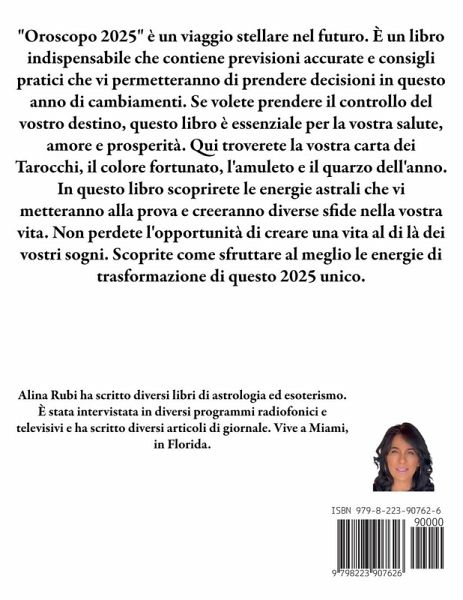 "Oroscopo 2025" è un viaggio stellare nel futuro. È un libro indispensabile che contiene previsioni accurate e consigli pratici che vi permetteranno di prendere decisioni in questo anno di cambiamenti. Se volete prendere il controllo del vostro destino, questo libro è essenziale per la vostra salute, amore e prosperità. Qui troverete la vostra carta dei Tarocchi, il colore fortunato, l'amuleto e il quarzo dell'anno. In questo libro scoprirete le energie astrali che vi metteranno alla prova e creeranno diverse sfide nella vostra vita. Non perdete l'opportunità di creare una vita al di là dei vostri sogni. Scoprite come sfruttare al meglio le energie di trasformazione di questo 2025 unico.