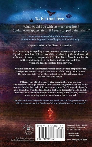 From the author of the award-winning Eloia Born series comes a sweeping new tale of hope and found family... "To be that free! What would I do with so much freedom? Could I even appreciate it, if I ever stopped being afraid?" Hope can exist in the direst of situations. In a desert city ravaged by a war between humans and gene-altered hybrids, homeless children are either enslaved by the underworld or housed in austere camps called Orphan Pods. Abandoned by his mother and trapped in the Pods, sixteen-year-old Toref yearns to free his sisters from slavery. With his friends, an illiterate mastermind and a double-amputee coder, Toref plans a rescue, but quickly runs afoul of the deadly casino bosses. His only hope is to recruit Idris, a street-savvy, hybrid hover-pilot. But her trust is hard won. Fifteen-year-old Idris nearly died escaping her own slavery. She dreams of finding a better life in the distant fringe territories and wants zero ties holding her back. Still, she cannot ignore Toref's anguished plea for help. He and his friends offer a kinship that Idris desperately needs, and she discovers a love she never thought possible. Saving Toref's sisters; however, means stepping into the casino bosses' dangerous web. Can Idris and Toref defeat the bosses and reach the safe fringe territories, or will the attempt cost the freedom of all who joined them on their quest? Join Idris and Toref on their quest to find freedom!