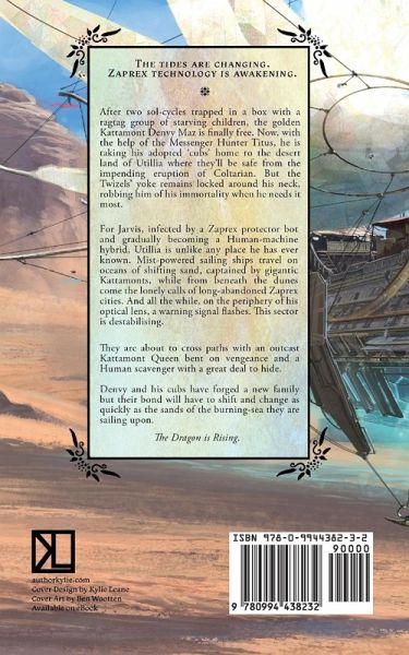 The tides are changing. Zaprex technology is awakening. After two sol-cycles trapped in a box with a ragtag group of sick and starving children, the golden Kattamont Denvy Maz is finally free. Now, with the help of the Messenger Hunter Titus, he is taking his adopted 'cubs' home to the desert land of Utillia where they'll be safe from the impending eruption of Coltarian. But the Twizels' yoke remains locked around his neck, robbing him of his immortality when he needs it most. For Jarvis, infected by a Zaprex protector bot and gradually becoming a Human-machine hybrid, Utillia is unlike any place he has ever known. Mist-powered sailing ships travel on oceans of shifting sand, captained by gigantic Kattamonts, while from beneath the dunes come the lonely calls of long-abandoned Zaprex cities. And all the while, on the periphery of his optical lens, a warning signal flashes. This sector is destabilising. They are about to cross paths with an outcast Kattamont Queen bent on vengeance and a Human scavenger with a great deal to hide. Denvy and his cubs have forged a new family but their bond will have to shift and change as quickly as the sands of the burning-sea they are sailing upon.