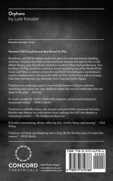 Comic Drama Characters: 3 male Interior Set Off-Broadway audiences gave this moving drama standing ovations. Two brothers live in a house in North Philly. Although adults, there is something child-like about these orphans. The eldest supports himself and his slightly retarded brother by petty thievery. One night he brings home a rich older man to get him drunk and rob him. It turns out that the man-Harold is very rich and on the lam from a hitman. Harold establishes the house as a base of operations and, in a strange, hilarious and moving way, becomes the father figure the boys have always yearned for. "A weird, wonderful thriller filled with suspense, pathos and packing an emotional wallop."-WMCA Radio "Keeps you transfixed."-New York Daily News