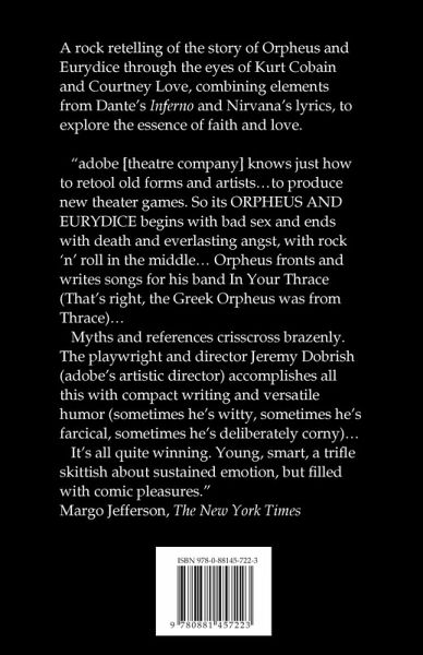 A rock retelling of the story of Orpheus and Eurydice through the eyes of Kurt Cobain and Courtney Love, combining elements from Dante's Inferno and Nirvana's lyrics, to explore the essence of faith and love. "adobe [theatre company] knows just how to retool old forms and artists … to produce new theater games. So its ORPHEUS AND EURYDICE begins with bad sex and ends with death and everlasting angst, with rock 'n' roll in the middle … Orpheus fronts and writes songs for his band In Your Thrace (That's right, the Greek Orpheus was from Thrace)… Myths and references crisscross brazenly. The playwright and director Jeremy Dobrish (adobe's artistic director) accomplishes all this with compact writing and versatile humor (sometimes he's witty, sometimes he's farcical, sometimes he's deliberately corny)… It's all quite winning. Young, smart, a trifle skittish about sustained emotion, but filled with comic pleasures." Margo Jefferson, The New York Times
