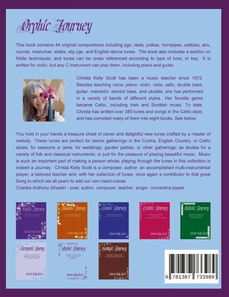 Orphic Journey contains 44 original compositions including jigs, reels, polkas, hornpipes, waltzes, airs, rounds, slides, slip jigs, mazurkas, and dance tunes, in the Celtic style for violin (fiddle) or any other C instrument such as flute, penny whistle, concertina, accordion, mandolin, banjo, guitar, or piano. Chord notation is included for accompaniment. It also contains personal inspirations and stories of Greek mythology, faeries, and fantasy, as well as a few pictures; all surrounded by graphics that could be colored if so desired. The Appendix includes instruction on how to play the Irish fiddle style as well as a breakdown of the tunes in their categories and keys. This is not your ordinary music book. It's a magical experience (journey) for the beginning musician as well as the seasoned professional. Orphic Journey is book #7 of eight books in the series "The Bardic Journeys of Kelawen".