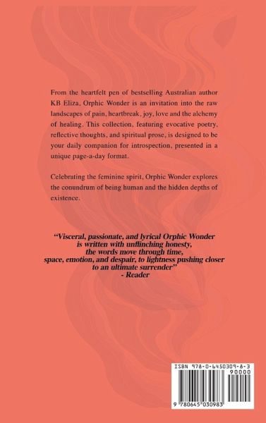 The year KB Eliza started to write stories was the year she tried to live in a treehouse. It was an unusually wet one, with thunder that made her dog shake. As a young child, she loved to escape into the dimension of storytelling, and she read literature to her dog to help with the shakes. This was also the year she experienced faith, hope, and a strong notion that there may be more beyond our world than we can perceive. A spiritual quest started, the muse for a life of metaphysical enquiry. Now the full-time Australian writer dedicates her time to simple living and extracting the thoughts and wonders that arrive most days, inspiring prose and heart filled pondering. Orphic Wonder is her second book of poetry.