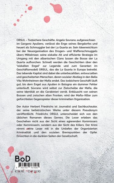ORSUL - Todsichere Geschäfte. Angelo Sovrano, aufgewachsen im Gargano Apuliens, verlässt die Enge seines Bergdorfes und heuert als Schmuggler bei der La Quarta in der Küstenstadt Manfredonia an. Sein Ideenreichtum bei der Neuorganisation des Drogen- und Waffenschmuggels übers Mittelmeer, seine eiskalte Alt und effiziente Strategie im Umgang mit den albanischen Clans lassen die Bosse der La Quarta aufhorchen. Schnell werden die Geschichten über den "eiskalten Engel" zur Legende und zum Garanten im Geschäftsmodell ORSUL, das die La Quarta in Europas Städten betreibt. Das lebende Kapital sind dabei die unterbezahlten, entwurzelten und gescheiterten Menschen, deren sozialer Abstieg in den Bella Vita Wohnheimen der Mafia endet. Das todsichere Geschäft läuft sehr gut, bis dem Engel aus Apulien in Bologna ein dummer Fehler unterläuft. Dabei wird er selbst zur Zielscheibe der Mafia, die seine Identität an die Carabinieri verrät. Enttäuscht von seinen Bossen und zwischen allen Fronten, wird der Mafia-Killer zum Gejagten und zum gefürchteten Gegenspieler dieser kriminellen Organisation.