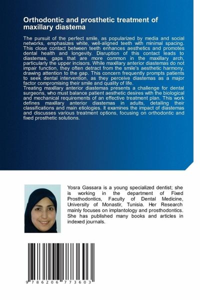 The pursuit of the perfect smile, as popularized by media and social networks, emphasizes white, well-aligned teeth with minimal spacing. This close contact between teeth enhances aesthetics and promotes dental health and longevity. Disruption of this contact leads to diastemas, gaps that are more common in the maxillary arch, particularly the upper incisors. While maxillary anterior diastemas do not impair function, they often detract from the smile's aesthetic harmony, drawing attention to the gap. This concern frequently prompts patients to seek dental intervention, as they perceive diastemas as a major factor compromising their smile and quality of life.Treating maxillary anterior diastemas presents a challenge for dental surgeons, who must balance patient aesthetic desires with the biological and mechanical requirements of an effective treatment plan. This work defines maxillary anterior diastemas in adults, detailing their classifications and main etiologies. It examines the impact of diastemas and discusses various treatment options, focusing on orthodontic and fixed prosthetic solutions.