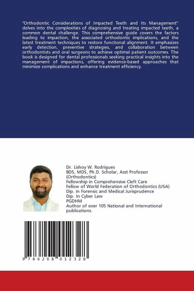 "Orthodontic Considerations of Impacted Teeth and Its Management" delves into the complexities of diagnosing and treating impacted teeth, a common dental challenge. This comprehensive guide covers the factors leading to impaction, the associated orthodontic implications, and the latest treatment techniques to restore functional alignment. It emphasizes early detection, preventive strategies, and collaboration between orthodontists and oral surgeons to achieve optimal patient outcomes. The book is designed for dental professionals seeking practical insights into the management of impactions, offering evidence-based approaches that minimize complications and enhance treatment efficiency.