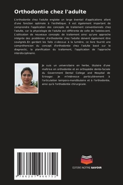 L'orthodontie chez l'adulte englobe un large éventail d'applications allant d'une fonction optimale à l'esthétique. Il est également important de comprendre l'application des concepts de traitement conventionnels chez l'adulte, car la physiologie de l'adulte est différente de celle de l'adoloscent. L'utilisation de nouveaux concepts de traitement ainsi qu'une approche intégrée des problèmes d'orthodontie chez l'adulte doivent également être soulignés.En gardant les faits ci-dessus à la lumière, ce livre fournit une compréhension du concept d'orthodontie chez l'adulte basé sur le diagnostic, la planification du traitement, l'application de l'approche interdisciplinaire.