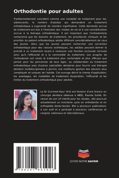 Traditionnellement considéré comme une modalité de traitement pour les adolescents, le nombre d'adultes qui demandent un traitement orthodontique a augmenté de manière significative. Cette demande accrue de traitement est due à l'évolution des modes de vie et à une sensibilisation accrue à la thérapie orthodontique. Il est important que l'orthodontiste comprenne que les besoins de traitement, les procédures cliniques et les priorités du patient orthodontique adulte diffèrent considérablement de ceux des jeunes. Alors que les jeunes peuvent rechercher une correction orthodontique pour des raisons esthétiques, les adultes peuvent donner la priorité à un traitement visant à restaurer une fonction occlusale normale ainsi qu'à l'efficacité et à la commodité du traitement. Les progrès de l'orthodontie ont rendu le traitement plus confortable et plus efficace que jamais pour les personnes de tous âges. La collaboration du traitement orthodontique avec d'autres spécialités dentaires pour fournir une thérapie dentaire multidisciplinaire a permis une meilleure gestion des besoins plus compliqués et uniques de l'adulte. Cet ouvrage décrit le champ d'application, les avantages, les modalités de traitement disponibles, l'efficacité et les limites du traitement orthodontique pour adultes.