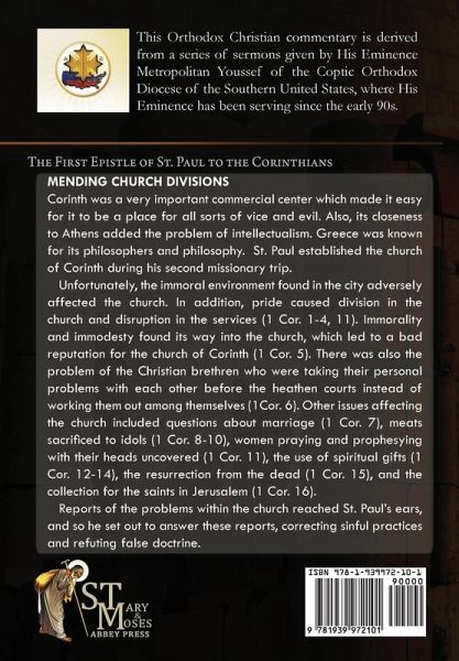 This Orthodox Christian commentary is derived from a series of sermons given by His Grace Bishop Youssef of the Coptic Orthodox Diocese of the Southern United States, where His Grace has been serving in this capacity since the early 90s. ABOUT THE BOOK: Corinth was a very important commercial center which made it easy for it to be a place for all sorts of vice and evil. Also, its closeness to Athens added the problem of intellectualism. Greece was known for its philosophers and philosophy. St. Paul established the church of Corinth during his second missionary trip. Unfortunately, the immoral environment found in the city adversely affected the church. In addition, pride caused division in the church and disruption in the services (1 Cor. 1-4, 11). Immorality and immodesty found its way into the church, which led to a bad reputation for the church of Corinth (1 Cor. 5). There was also the problem of the Christian brethren who were taking their personal problems with each other before the heathen courts instead of working them out among themselves (1Cor. 6). Other issues affecting the church included questions about marriage (1 Cor. 7), meats sacrificed to idols (1 Cor. 8-10), women praying and prophesying with their heads uncovered (1 Cor. 11), the use of spiritual gifts (1 Cor. 12-14), the resurrection from the dead (1 Cor. 15), and the collection for the saints in Jerusalem (1 Cor. 16). Reports of the problems within the church reached St. Paul's ears, and so he set out to answer these reports, correcting sinful practices and refuting false doctrine.
