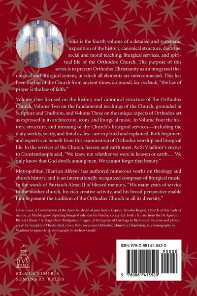 This is the fourth volume of a detailed and systematic exposition of the history, canonical structure, doctrine, moral and social teaching, liturgical services, and spiritual life of the Orthodox Church. The purpose of this series is to present Orthodox Christianity as an integrated theological and liturgical system, in which all elements are interconnected. Volume One focused on the history and canonical structure of the Orthodox Church; Volume Two on the fundamental teachings of the Church, grounded in Scripture and Tradition; Volume Three on the unique aspects of Orthodox art as expressed in its architecture, icons, and liturgical music. In Volume Four the history, structure, and meaning of the Church's liturgical services-including the daily, weekly, yearly, and festal cycles-are explored and explained. Both beginners and experts can benefit from this thorough examination of Orthodox worship and liturgical life. In the services of the Church, heaven and earth meet. As St Vladimir's envoys to Constantinople said, "We knew not whether we were in heaven or earth.... We only know that God dwells among men. We cannot forget that beauty."
