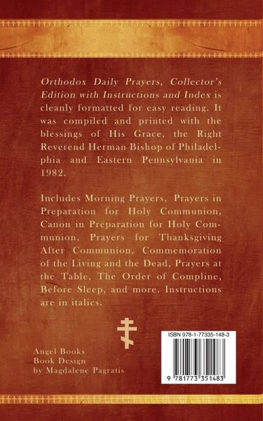 Orthodox Daily Prayers, Collector's Edition with Instructions and Index, is cleanly formatted for easy reading, It was compiled and printed with the blessings of His Grace, the Right Reverend Herman Bishop of Philadelphia and Eastern Pennsylvania in 1982. Includes Morning Prayers, Prayers in Preparation for Holy Communion, Canon in Preparation for Holy Communion, Prayers for Thanksgiving After Communion, Commemoration of the Living and the Dead, Prayers at the Table, The Order of Compline, Before Sleep, and more. Instructions in italics.