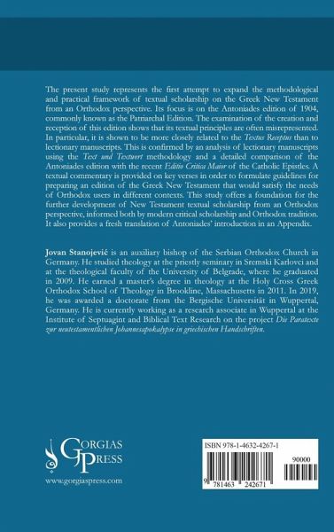 The present study represents the first attempt to expand the methodological and practical framework of textual scholarship on the Greek New Testament from an Orthodox perspective. Its focus is on the Antoniades edition of 1904, commonly known as the Patriarchal Edition. The examination of the creation and reception of this edition shows that its textual principles are often misrepresented. In particular, it is shown to be more closely related to the Textus Receptus than to lectionary manuscripts. This is confirmed by an analysis of lectionary manuscripts using the Text und Textwert methodology and a detailed comparison of the Antoniades edition with the recent Editio Critica Maior of the Catholic Epistles. A textual commentary is provided on key verses in order to formulate guidelines for preparing an edition of the Greek New Testament that would satisfy the needs of Orthodox users in different contexts. This study offers a foundation for the further development of New Testament textual scholarship from an Orthodox perspective, informed both by modern critical scholarship and Orthodox tradition. It also provides a fresh translation of Antoniades' introduction in an Appendix.