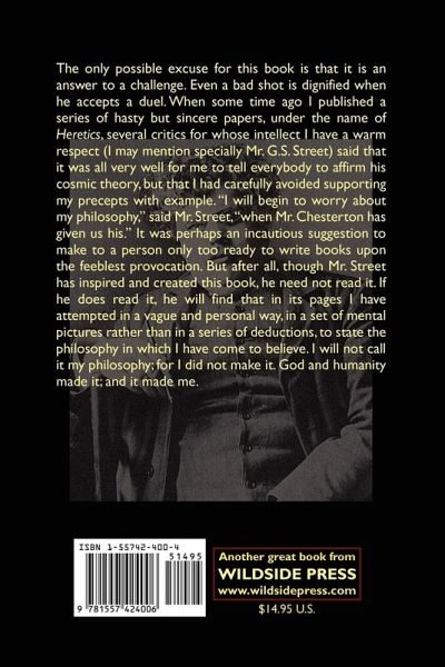 The only possible excuse for this book is that it is an answer to a challenge. Even a bad shot is dignified when he accepts a duel. When some time ago I published a series of hasty but sincere papers, under the name of "Heretics," several critics for whose intellect I have a warm respect (I may mention specially Mr. G.S. Street) said that it was all very well for me to tell everybody to affirm his cosmic theory, but that I had carefully avoided supporting my precepts with example. "I will begin to worry about my philosophy," said Mr. Street, "when Mr. Chesterton has given us his." It was perhaps an incautious suggestion to make to a person only too ready to write books upon the feeblest provocation. But after all, though Mr. Street has inspired and created this book, he need not read it. If he does read it, he will find that in its pages I have attempted in a vague and personal way, in a set of mental pictures rather than in a series of deductions, to state the philosophy in which I have come to believe. I will not call it my philosophy; for I did not make it. God and humanity made it; and it made me.
