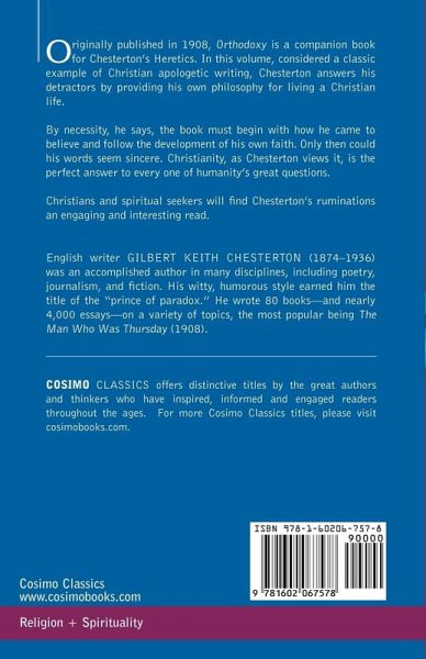 Originally published in 1908, Orthodoxy is a companion book for Chesterton's Heretics. In this volume, considered a classic example of Christian apologetic writing, Chesterton answers his detractors by providing his own philosophy for living a Christian life. By necessity, he says, the book must begin with how he came to believe and follow the development of his own faith. Only then could his words seem sincere. Christianity, as Chesterton views it, is the perfect answer to every one of humanity's great questions. Christians and spiritual seekers will find Chesterton's ruminations an engaging and interesting read. English writer GILBERT KEITH CHESTERTON (1874-1936) was an accomplished author in many disciplines, including poetry, journalism, and fiction. His witty, humorous style earned him the title of the "prince of paradox." He wrote 80 books-and nearly 4,000 essays-on a variety of topics, the most popular being The Man Who Was Thursday (1908).