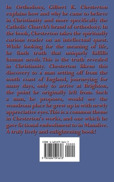 In Orthodoxy, Gilbert K. Chesterton explains how and why he came to believe in Christianity and more specifically the Catholic Church's brand of orthodoxy. In the book, Chesterton takes the spiritually curious reader on an intellectual quest. While looking for the meaning of life, he finds truth that uniquely fulfills human needs. This is the truth revealed in Christianity. Chesterton likens this discovery to a man setting off from the south coast of England, journeying for many days, only to arrive at Brighton, the point he originally left from. Such a man, he proposes, would see the wondrous place he grew up in with newly appreciative eyes. This is a common theme in Chesterton's works, and one which he gave fictional embodiment to in Manalive. A truly lively and enlightening book!