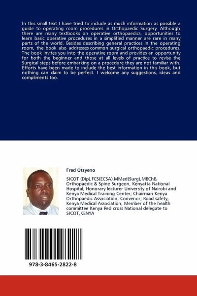 In this small text I have tried to include as much information as possible a guide to operating room procedures in Orthopaedic Surgery. Although there are many textbooks on operative orthopaedics, opportunities to learn basic operative procedures in a simplified manner are rare in many parts of the world. Besides describing general practices in the operating room, the book also addresses common surgical orthopaedic procedures. The book invites you into the operative room and provides an opportunity for both the beginner and those at all levels of practice to revise the Surgical steps before embarking on a procedure they are not familiar with. Efforts have been made to include the best information in this book, but nothing can claim to be perfect. I welcome any suggestions, ideas and compliments too.
