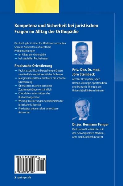 Das Buch richtet sich an Orthopäden, die in vertrauter Sprache und Form Antworten auf spezifische juristische Fragen und Probleme suchen. Die gemeinsame Erarbeitung durch einen Juristen und Orthopäden erlauben eine hohe Praxisrelevanz bei gleichzeitiger juristischer Genauigkeit. Typische Situationen und Probleme des orthopädischen Alltags in Klinik und Praxis werden juristisch durchleuchtet. Sofort umsetzbare Antworten werden ergänzt durch Checklisten und Praxistipps. Zukünftige Entwicklungen wie der Einfluss des europäischen Rechts auf die tägliche Arbeit oder auch Netzstrukturen werden berücksichtigt. Ein detailliertes Stichwortverzeichnis erleichtert das Auffinden der entsprechenden Themen. Das Buch richtet sich an Orthopäden aber auch an Ärzte in der orthopädischen Weiterbildung in Klinik, Praxis und Verwaltung, um insbesondere Unsicherheiten in Bezug auf juristische Fragen dieses Fachgebietes zu nehmen.