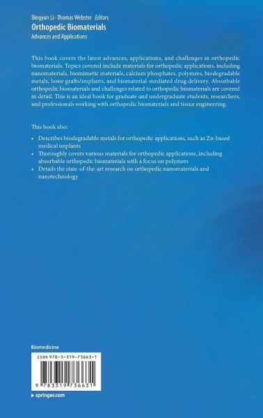 This book covers the latest advances, applications, and challenges in orthopedic biomaterials. Topics covered include materials for orthopedic applications, including nanomaterials, biomimetic materials, calcium phosphates, polymers, biodegradable metals, bone grafts/implants, and biomaterial-mediated drug delivery. Absorbable orthopedic biomaterials and challenges related to orthopedic biomaterials are covered in detail. This is an ideal book for graduate and undergraduate students, researchers, and professionals working with orthopedic biomaterials and tissue engineering.