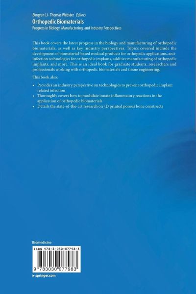 - Part I Design, Manufacturing, Assessment, and Applications. - Nanotechnology for Orthopedic Applications: From Manufacturing Processes to Clinical Applications. - Additive Manufacturing of Orthopedic Implants. - 3 D Printed Porous Bone Constructs. - Biopolymer Based Interfacial Tissue Engineering for Arthritis. - Performance of Bore-Cone Taper Junctions on Explanted Total Knee Replacements with Modular Stem Extensions: Mechanical Disassembly and Corrosion Analysis of Two Designs. - Wear Simulation Testing for Joint Implants. - Mechanical Stimulation Methods for Cartilage Tissue Engineering. - Mechanically Assisted Electrochemical Degradation of Alumina-TiC Composites. - Part II Biology and Clinical and Industrial Perspectives. - Biomaterials in Total Joint Arthroplasty. - Modulating Innate Inflammatory Reactions in the Application of Orthopedic Biomaterials. - Anti-Infection Technologies for Orthopedic Implants: Materials and Considerations for Commercial Development. - Platelet Rich Plasma: Biology and Clinical Usage in Orthopedics. - Bioresorbable Materials for Orthopedic Applications (Lactide and Glycolide Based). - The Role of Polymer Additives in Enhancing the Response of Calcium Phosphate Cement. - Biological Fixation: The Role of Screw Surface Design. - Fracture Fixation Biomechanics and Biomaterials. - Biomaterials for Bone Tissue Engineering: Recent Advances and Challenges. - Progress of Bioceramic and Bioglass Bone Scaffolds for Load-Bearing Applications.