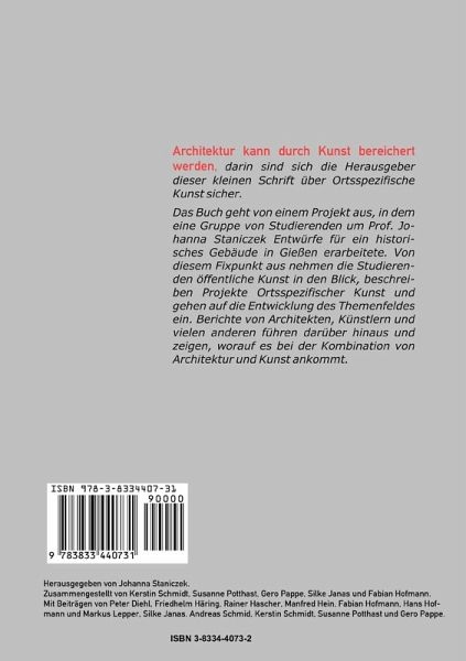 "Architektur kann durch Kunst bereichert werden, darin sind sich die Autoren dieser kleinen Schrift über Ortsspezifische Kunst sicher. Das Buch geht von einem Projekt aus, in dem eine Gruppe von Studierenden um Prof. Johanna Staniczek Entwürfe für ein historisches Gebäude in Gießen erarbeitete. Von diesem Fixpunkt aus nehmen die Studierenden öffentliche Kunst in den Blick, beschreiben Projekte Ortsspezifischer Kunst und gehen näher auf das Themenfeld ein. Berichte von Architekten, Künstlern und vielen anderen führen darüber hinaus und zeigen, worauf es bei der Kombination von Architektur und Kunst ankommt. "Innerhalb des Museums funktioniert der Künstler als Mittelpunkt eines bestimmten Systems; außerhalb dieses Systems ist er verloren zwischen Welten - die Position des Künstlers in unserer Kultur ist marginal. Der öffentliche Künstler kann diese Marginalität zu seinem Vorteil verwenden." (Vito Acconci). Wenn dies mit Künstlern und Architekten in gleichberechtigter Partnerschaft geschieht, dann hat die ortsspezifische Kunst ihren Ort in der Gesellschaft gefunden."