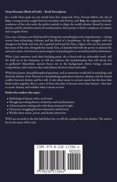 Ortus Deorum (Birth of Gods) - Book Description In a world where gods are not merely born but composed, Ortus Deorum follows the tale of Liza, a young woman caught between mortality and divinity, and Tom, the enigmatic bird-like conductor of fate who seeks the perfect melody to shape the world's destiny. Bound by music, destiny, and the relentless march of transformation, their journey is both a symphony of creation and a tragedy of loss. Liza, once a human, now finds herself evolving into something beyond comprehension-a being woven from technology, alchemy, and the blood of a lycanthrope. As she struggles with the changes in her body and soul, she is guided and tested by Noés, a figure who sees her potential but warns of the cost. Alongside her stands Tom, a Clamado bird with the power to channel the universe's music, torn between protecting her and pushing her to ascend beyond her limitations. When Liza's emotions reach their breaking point, she is faced with an unbearable truth: will she hold on to her humanity, or will she embrace the transformation that will elevate her to godhood? Meanwhile, ancient forces stir in the background-divine beings, celestial compositions, and a universe that seeks balance between chaos and order. With lyrical prose, deep philosophical questions, and an immersive world rich in mythology and futuristic fantasy, Ortus Deorum is a breathtaking exploration of power, identity, and the eternal conflict between destiny and free will. A tale where music is not just sound, but the force that binds reality together, this is a story of those who dare to become more than human-who dare to create, destroy, and redefine what it means to exist. Perfect for readers who enjoy:Mythological fantasy with a sci-fi twist Thought-provoking themes of identity and transformation A lyrical, poetic writing style with deep emotional weight Characters struggling between humanity and divinity Worlds where music, power, and destiny intertwine Will Liza succumb to the fate laid before her, or will she compose her own destiny? The answer lies in the music of her soul.