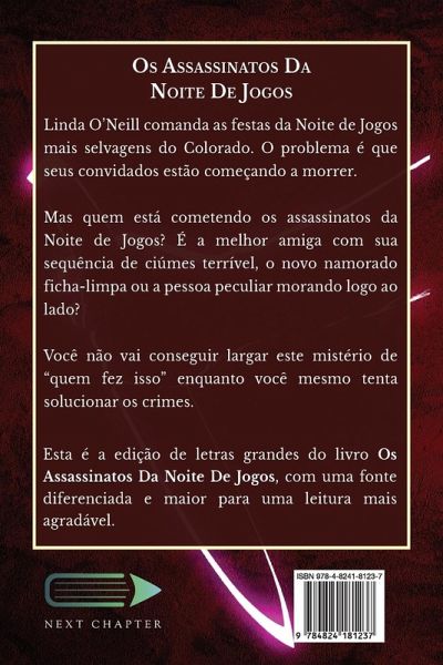 Linda O'Neill comanda as festas da Noite de Jogos mais selvagens do Colorado. O problema é que seus convidados estão começando a morrer. Mas quem está cometendo os assassinatos da Noite de Jogos? É a melhor amiga com sua sequência de ciúmes terrível, o novo namorado ficha-limpa ou a pessoa peculiar morando logo ao lado? Você não vai conseguir largar este mistério de "quem fez isso" enquanto você mesmo tenta solucionar os crimes. Esta é a edição de letras grandes do livro Os Assassinatos Da Noite De Jogos, com uma fonte diferenciada e maior para uma leitura mais agradável.