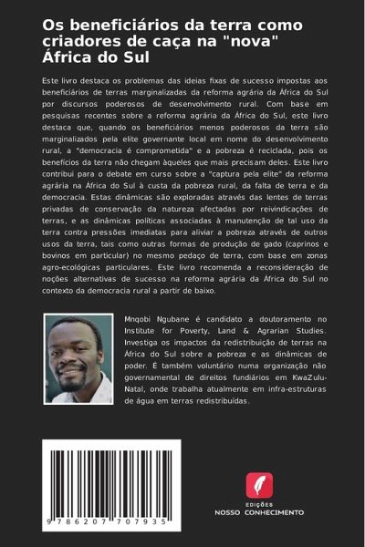 Este livro destaca os problemas das ideias fixas de sucesso impostas aos beneficiários de terras marginalizadas da reforma agrária da África do Sul por discursos poderosos de desenvolvimento rural. Com base em pesquisas recentes sobre a reforma agrária da África do Sul, este livro destaca que, quando os beneficiários menos poderosos da terra são marginalizados pela elite governante local em nome do desenvolvimento rural, a "democracia é comprometida" e a pobreza é reciclada, pois os benefícios da terra não chegam àqueles que mais precisam deles. Este livro contribui para o debate em curso sobre a "captura pela elite" da reforma agrária na África do Sul à custa da pobreza rural, da falta de terra e da democracia. Estas dinâmicas são exploradas através das lentes de terras privadas de conservação da natureza afectadas por reivindicações de terras, e as dinâmicas políticas associadas à manutenção de tal uso da terra contra pressões imediatas para aliviar a pobreza através de outros usos da terra, tais como outras formas de produção de gado (caprinos e bovinos em particular) no mesmo pedaço de terra, com base em zonas agro-ecológicas particulares. Este livro recomenda a reconsideração de noções alternativas de sucesso na reforma agrária da África do Sul no contexto da democracia rural a partir de baixo.