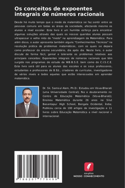 Desde há muito tempo que o medo da matemática se faz sentir entre as pessoas comuns em todas as áreas da sociedade, afectando mesmo os alunos a nível escolar. Este livro é um humilde esforço para encontrar algumas soluções através das quais os nossos queridos alunos possam ultrapassar o velho mito do "medo" na aprendizagem da Matemática. Para além disso, o autor apresenta também alguns "Conhecimentos Técnicos" na resolução prática de problemas matemáticos, com os quais se depara como professor do ensino secundário, dia após dia. Neste livro, o autor discute de forma fácil, genial e tolerante os problemas relativos aos principais conceitos: Exponentes integrais de números racionais que têm surgido nos programas de estudo da W.B.B.S.E. bem como do C.I.S.C.E. Este livro será útil para os alunos das escolas e os seus professores, estudantes e professores de B.Ed., criadores de currículos, investigadores de vários níveis e todos aqueles que estão interessados em aprender matemática.