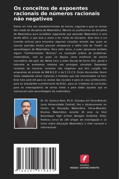 Existe um mito nos estabelecimentos de ensino, segundo o qual os alunos têm medo da disciplina de Matemática. Mesmo os professores da disciplina de Matemática pura acreditam vagamente que aprender Matemática é uma tarefa difícil, o que leva o aluno a ter medo da disciplina. Este livro é um humilde esforço para encontrar algumas soluções através das quais os nossos queridos alunos possam ultrapassar o velho mito do "medo" na aprendizagem da Matemática. Para além disso, o autor apresenta também alguns "Conhecimentos Técnicos" na resolução prática de problemas matemáticos, com os quais se depara como professor do ensino secundário, dia após dia. Neste livro, o autor discute de forma fácil, genial e tolerante os problemas relativos aos principais conceitos: Expoentes racionais de números racionais não negativos que têm surgido nos programas de estudo da W.B.B.S.E. e do C.I.S.C.E. Estas discussões foram feitas adoptando vários materiais e métodos que são mencionados no livro. Este livro será útil para os alunos das escolas e para os seus professores, para os estudantes e professores de B.Ed., para os criadores de currículos, para os investigadores de vários níveis e para todos aqueles que se interessam pela aprendizagem da matemática.