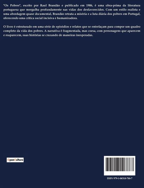 "Os Pobres" de Raul Brandão é uma obra que mergulha profundamente na vida dos marginalizados e desprivilegiados da sociedade portuguesa do início do século XX. A narrativa é centrada em personagens que vivem à margem, como o Gebo, um velho gordo e desgraçado, e as mulheres que se prostituem para sobreviver. Brandão descreve a vida dessas pessoas com uma sensibilidade aguda, revelando a dor, a humilhação e a luta constante pela sobrevivência. O Gebo, por exemplo, é um personagem que, apesar de suas desventuras e da zombaria que enfrenta, mantém uma bondade inerente e uma resignação tocante. As mulheres, por outro lado, são retratadas como vítimas de um destino cruel, presas em uma vida de sofrimento e exploração. Através de suas histórias, Brandão expõe a hipocrisia e a indiferença da sociedade, que constrói instituições como hospitais para esconder o sofrimento dos pobres, mas não para aliviá-lo. A obra é uma crítica poderosa à injustiça social e uma exploração da condição humana, onde a dor e o amor se entrelaçam de maneira complexa. Brandão utiliza uma linguagem rica em imagens e metáforas para transmitir a profundidade do sofrimento humano, tornando "Os Pobres" uma obra de grande impacto emocional e social.