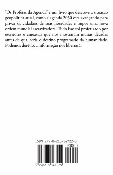"Os Profetas da Agenda" é um livro que descreve a situação geopolítica atual, como a agenda 2030 está avançando para privar os cidadãos de suas liberdades e impor uma nova ordem mundial escravizadora. Tudo isso foi profetizado por escritores e cineastas que nos mostraram muitas décadas antes de qual seria o destino programado da humanidade. Podemos detê-lo, a informação nos libertará.