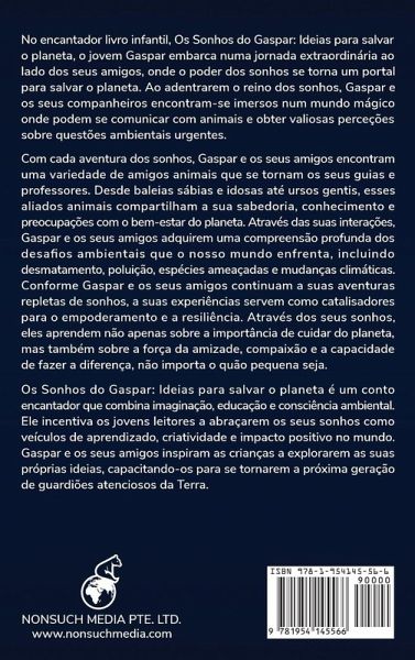 In the heartwarming children's book, Os Sonhos do Gaspar: Ideias para salvar o planeta (Portuguese Edition), young Gaspar sets out on an extraordinary quest with his friends, where the power of dreams opens up a gateway to safeguarding the planet. As they wander into the realm of dreams, Gaspar and his companions become immersed in a mystical world where they can communicate with creatures and gain insightful knowledge of pressing environmental concerns. With each venture into the dream world, Gaspar and his friends meet several animals who act as their guides and teachers. From wise whales to playful sloths and gentle bears, these animal companions share their perceptions, understanding, and preoccupations about the planet's well-being. Through their interactions, Gaspar and his friends develop an understanding of the environmental challenges our world faces, including deforestation, pollution, endangered species, and climate change. As Gaspar and his friends continue their dream journeys, their experiences act as catalysts for empowerment and perseverance. Through their dreams, they learn the significance of caring for the planet and the strength of friendship, sympathy, and the ability to make a difference, regardless of how small. "Os Sonhos do Gaspar: Ideias para salvar o planeta" is a delightful tale that weaves together imagination, education, and environmental awareness. It stimulates young readers to embrace their dreams as opportunities for learning, creativity, and positively impacting the world. Gaspar and his friends encourage children to explore their notions, enabling them to become the next generation of mindful caretakers of the Earth.