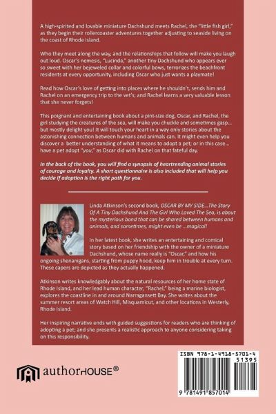 A high-spirited and lovable miniature Dachshund meets Rachel, the "little fish girl," as they begin their rollercoaster adventures together adjusting to seaside living on the coast of Rhode Island. Who they meet along the way, and the relationships that follow will make you laugh out loud. Oscar's nemesis, "Lucinda," another tiny Dachshund who appears ever so sweet with her bejeweled collar and colorful bows, terrorizes the beachfront residents at every opportunity, including Oscar who just wants a playmate! Read how Oscar's love of getting into places where he shouldn't, sends him and Rachel on an emergency trip to the vet's; and Rachel learns a very valuable lesson that she never forgets! This poignant and entertaining book about a pint-size dog, Oscar, and Rachel, the girl studying the creatures of the sea, will make you chuckle and sometimes gasp... but mostly delight you! It will touch your heart in a way only stories about the astonishing connection between humans and animals can. It might even help you discover a better understanding of what it means to adopt a pet; or in this case...have a pet adopt "you," as Oscar did with Rachel on that fateful day. In the back of the book, you will find a synopsis of heartrending animal stories of courage and loyalty. A short questionnaire is also included that will help you decide if adoption is the right path for you.